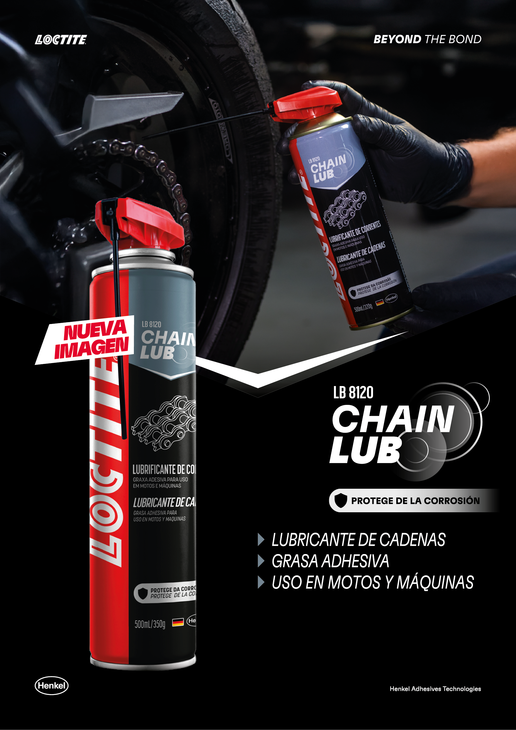 Lubricante de cadenas de acción prolongada. Alta adhesión a metales, protege contra la corrosión y reduce desgaste incluso en condiciones severas. Aplicación en piezas sujetas a la presión, golpes y vibraciones.